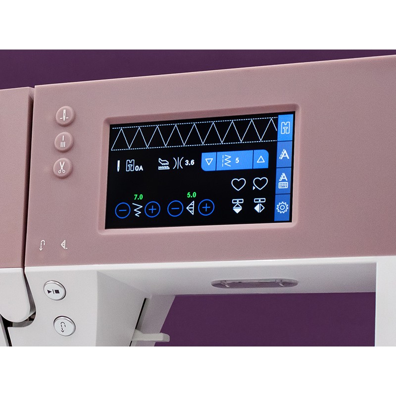 Цветной дисплей 95×54 мм реагирует на касание пальца. Выбираете строчку — она тут же показывается в натуральную величину. Машина сама подбирает оптимальные настройки (ширина, длина, натяжение). Вы просто нажимаете «Старт».